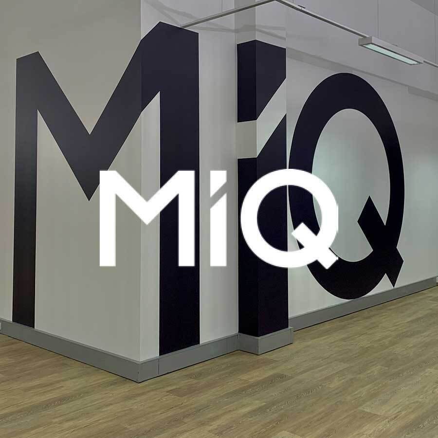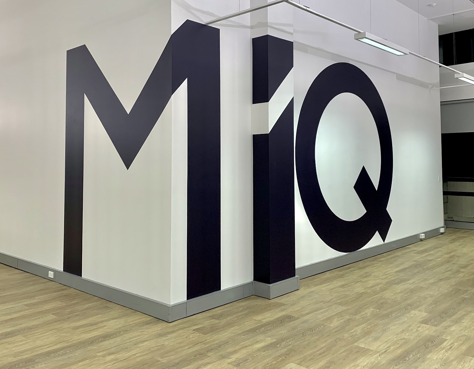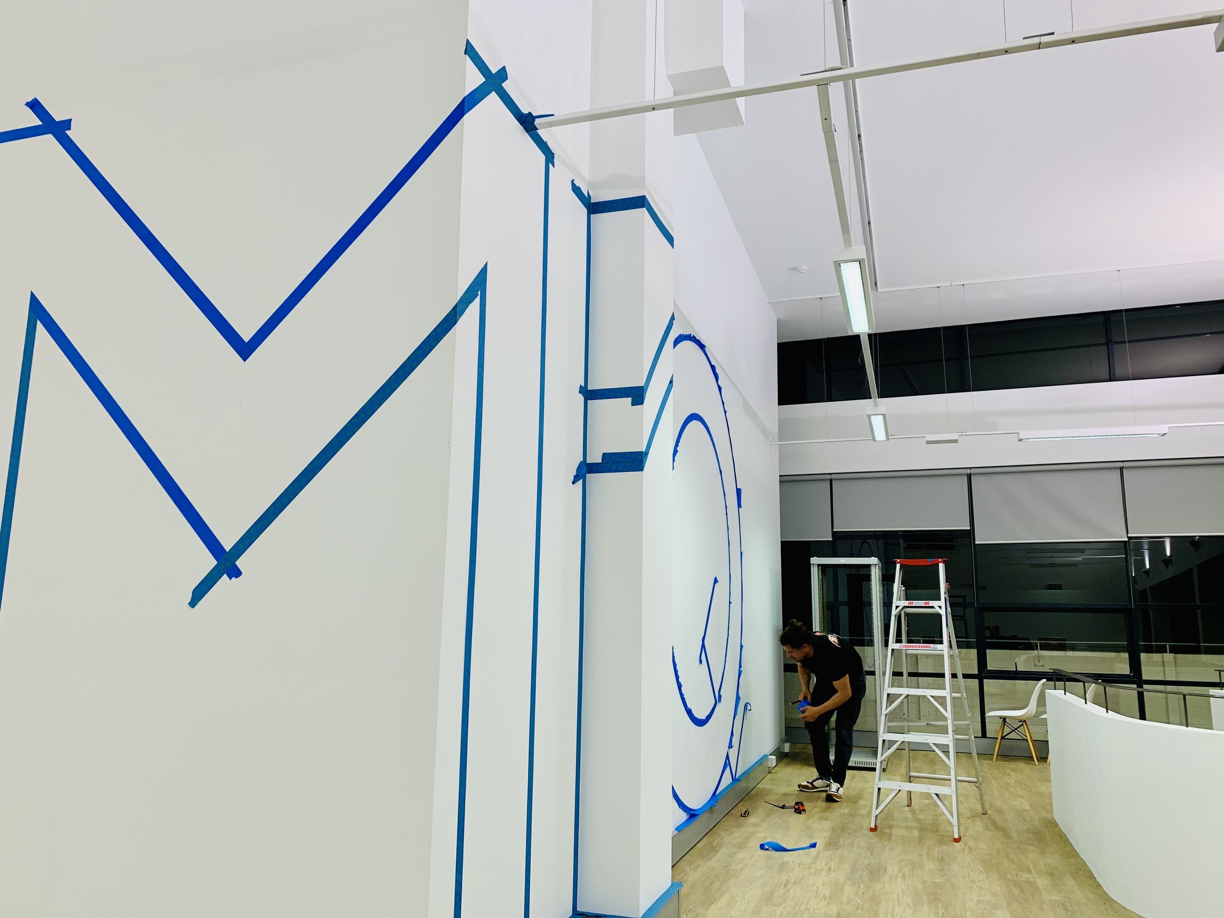 With 3.5 m high ceilings there was a lot of wall to cover in the Sydney office so Emma decided to get creative by custom designing hand painted graphics to fill some of the space. With the help of her partner Sando and a lot of masking tape this was to be the first of many hand painted large scale MiQ logo walls, at 2.5 m this was the largest and with so much space to cover Emma decided to take elements of this throughout entire office. Using her laptop Emma firstly designs the graphics precisely to scale for approval by the clients before skillfully being transferred by hand to the wall.