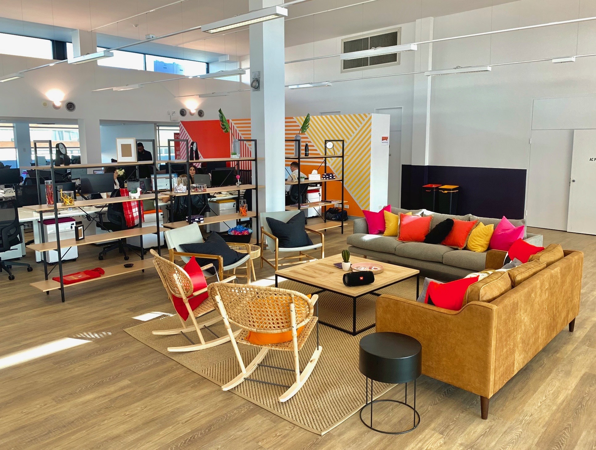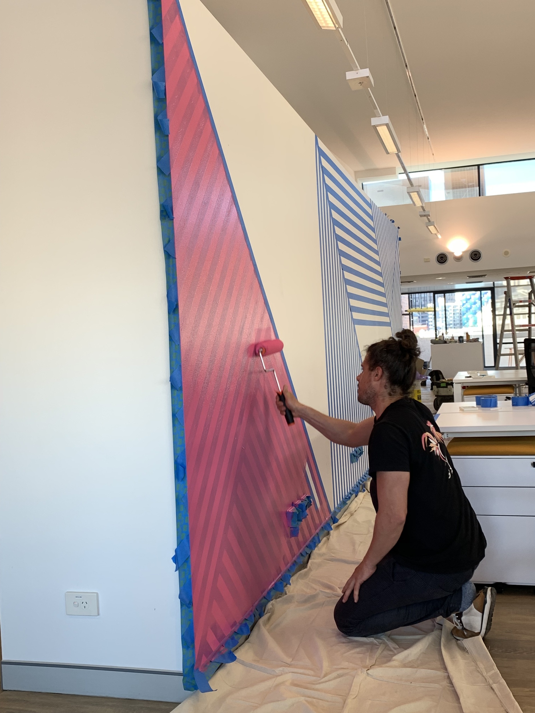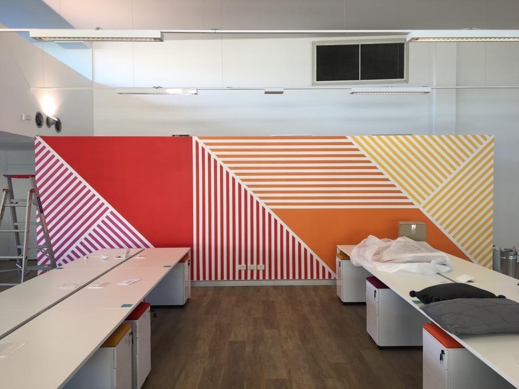 With 3.5 m high ceilings there was a lot of wall to cover in the Sydney office so Emma decided to get creative by custom designing hand painted graphics to fill some of the space. With the help of her partner Sando and a lot of masking tape this was to be the first of many hand painted large scale MiQ logo walls, at 2.5 m this was the largest and with so much space to cover Emma decided to take elements of this throughout entire office. Using her laptop Emma firstly designs the graphics precisely to scale for approval by the clients before skillfully being transferred by hand to the wall.