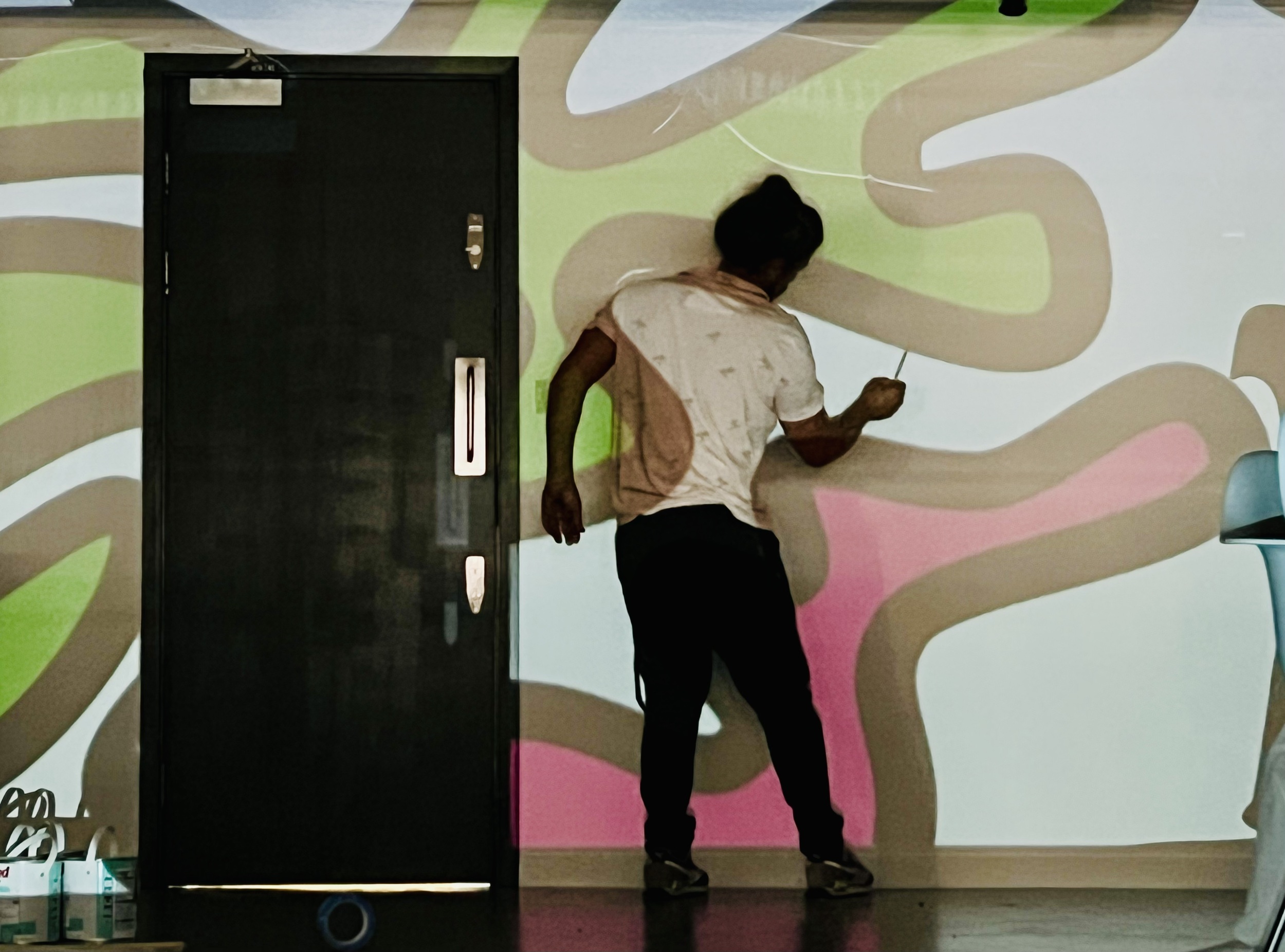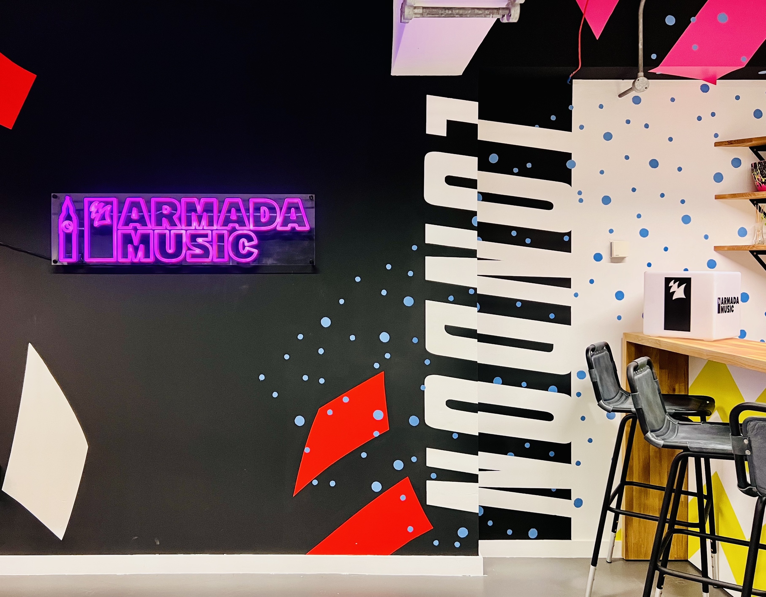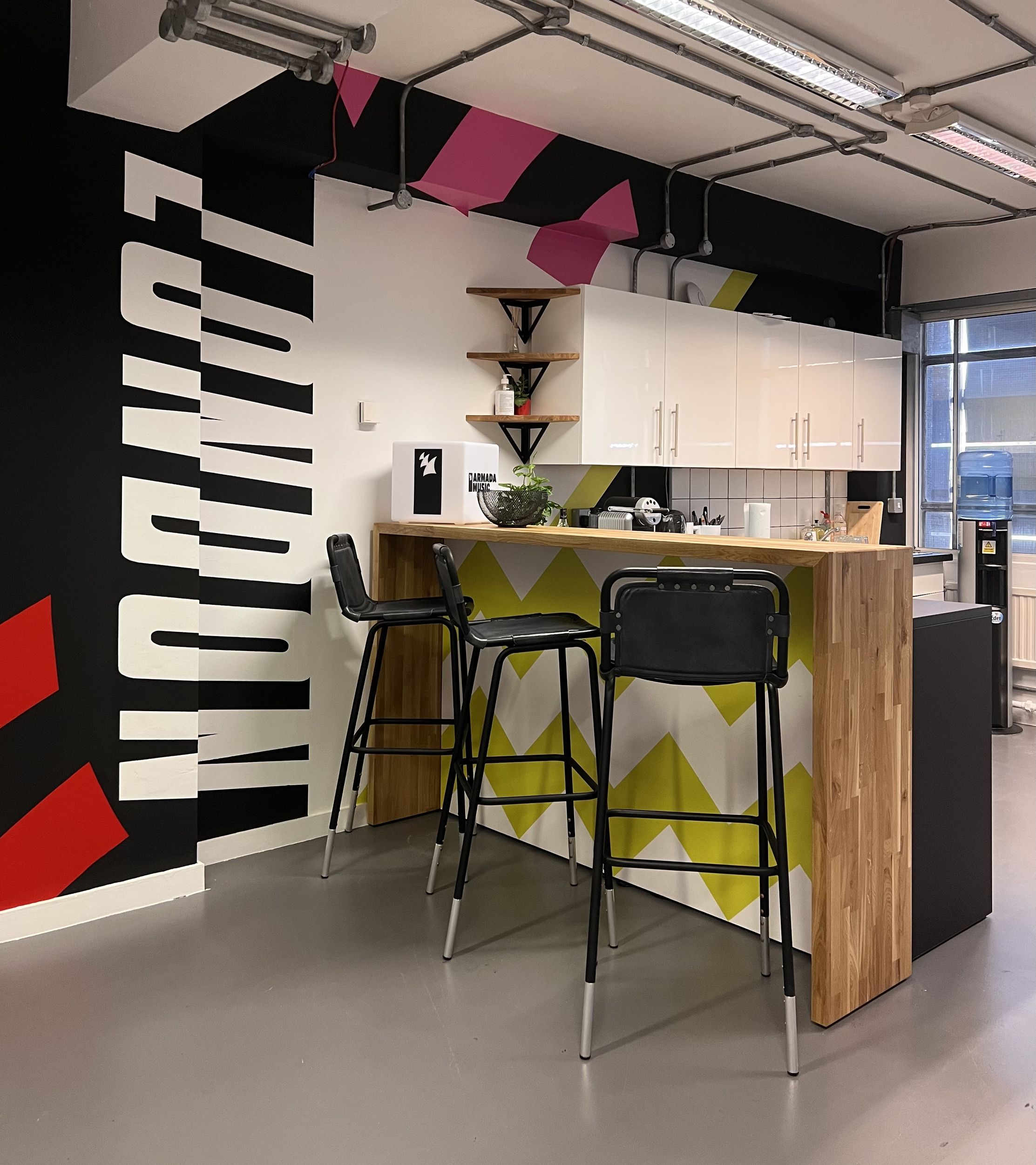 Armada's office was severely lacking in brand personality so when they came to Emma with their project she knew straight away that painting the walls would be an incredible way to inject some of their unique edgy style into the space. Having studied their website and brand guide as well as taking in to account concepts for their Amsterdam HQ Emma designed a fully bespoke set of illustrations to be transferred to the walls by hand.
