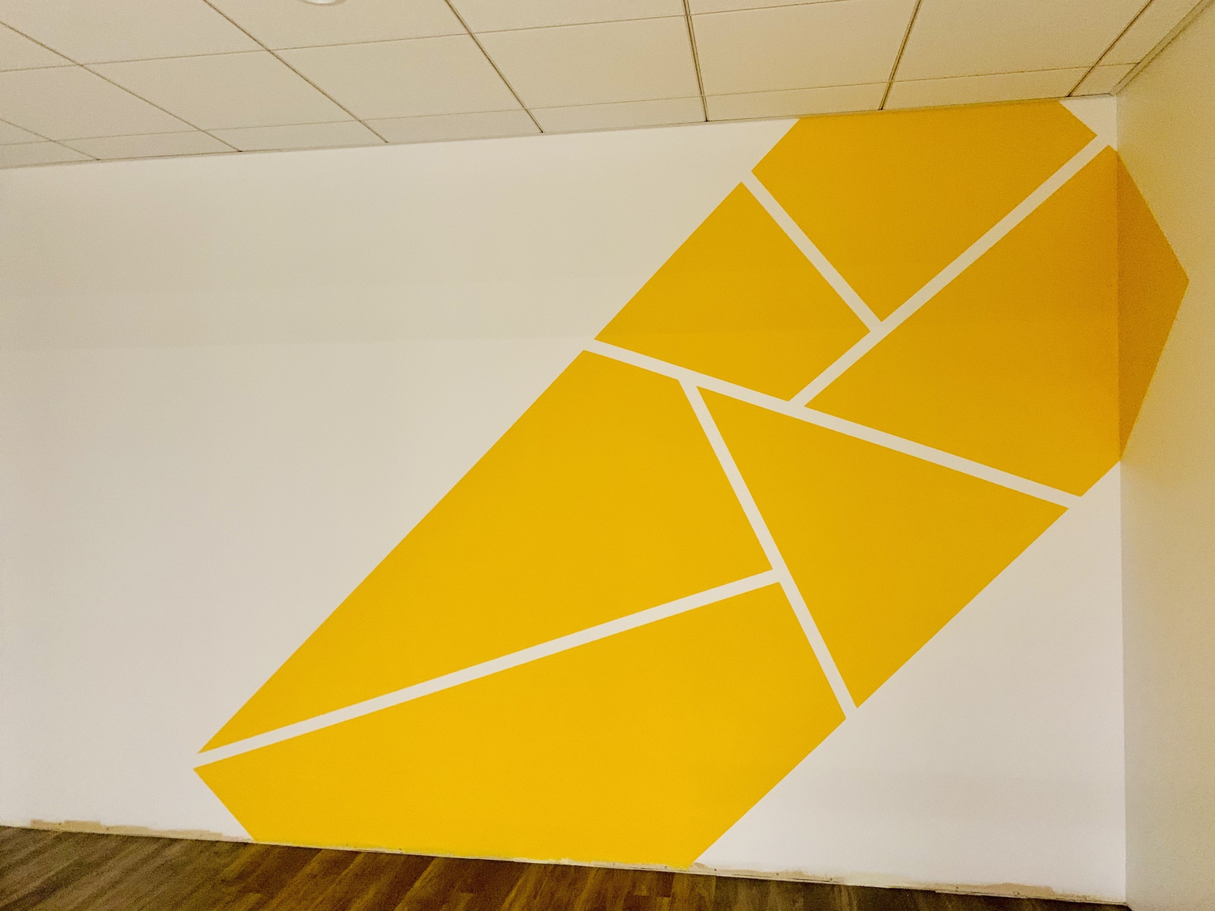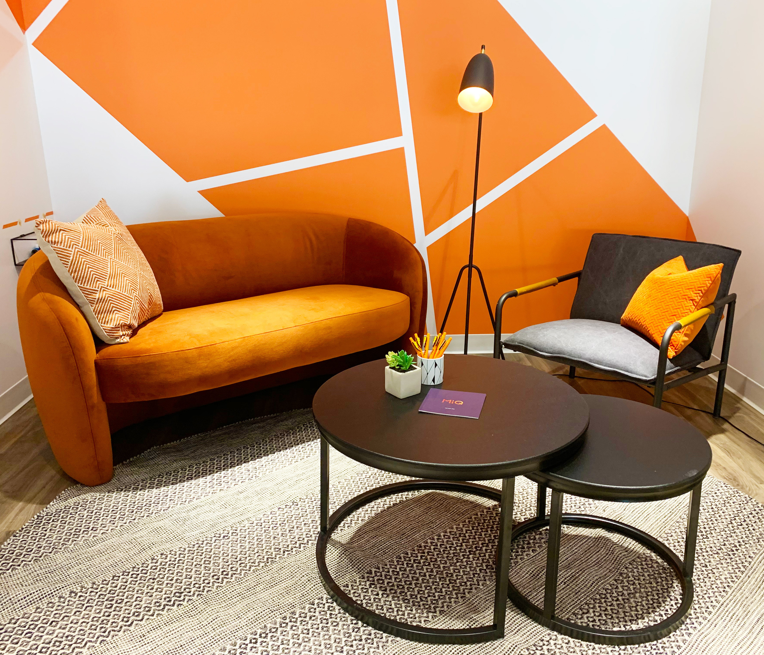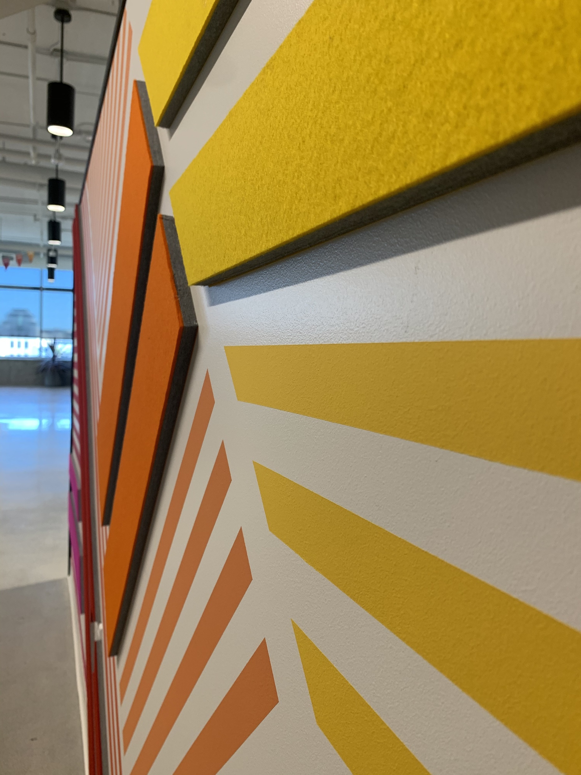Having already added a few giant logos to other offices Emma new immediately that this corner wall as you entered the office would be perfect for one of her giant MiQ's. In addition the this rather than opt for vinyl covering Emma hand painted each of the meeting rooms with a geometric pattern in it's corresponding colour as well as a bespoke 3D geometric wall behind the reception desk using paint and off cuts from the acoustic felt used in the phone booths.