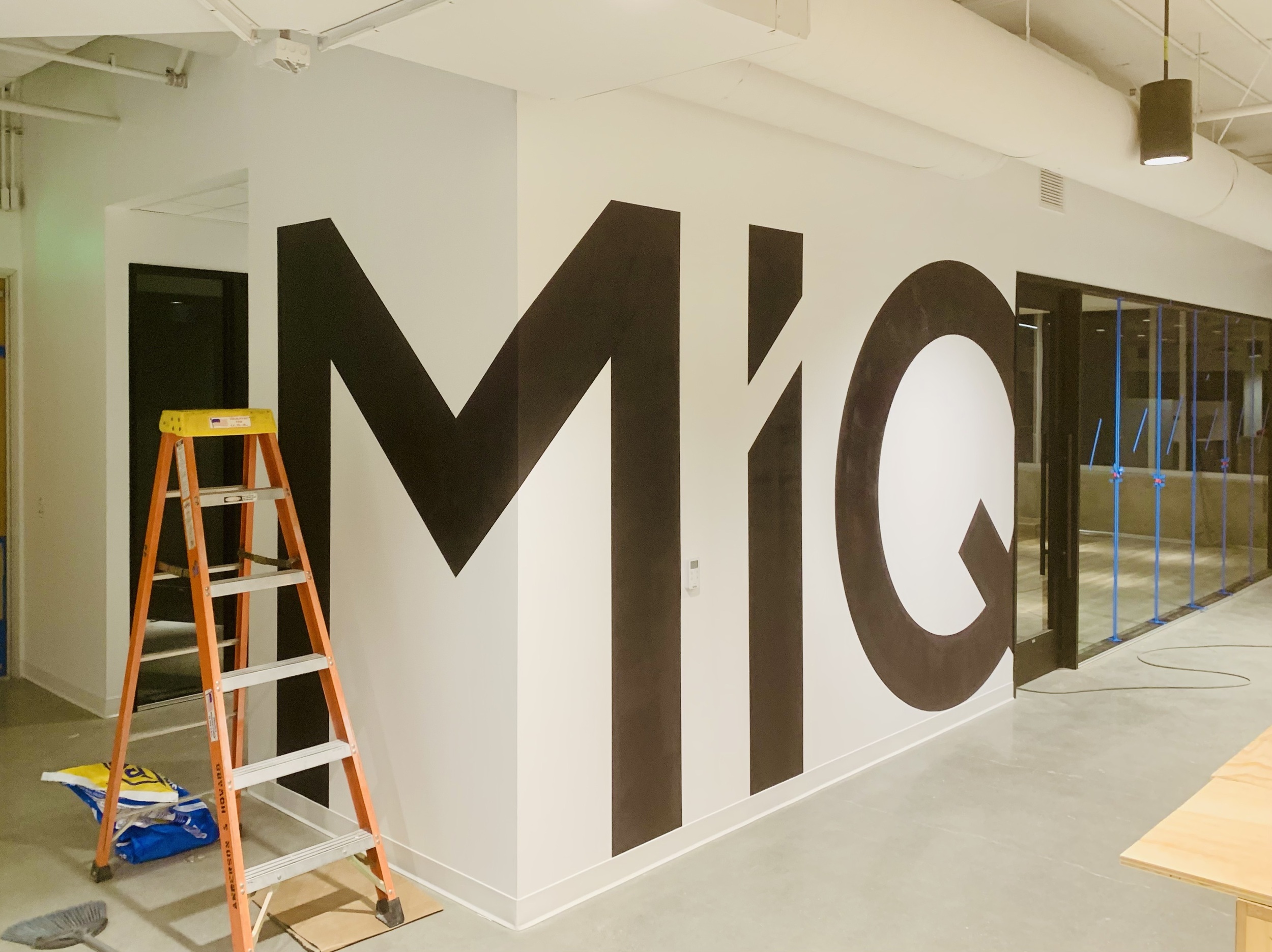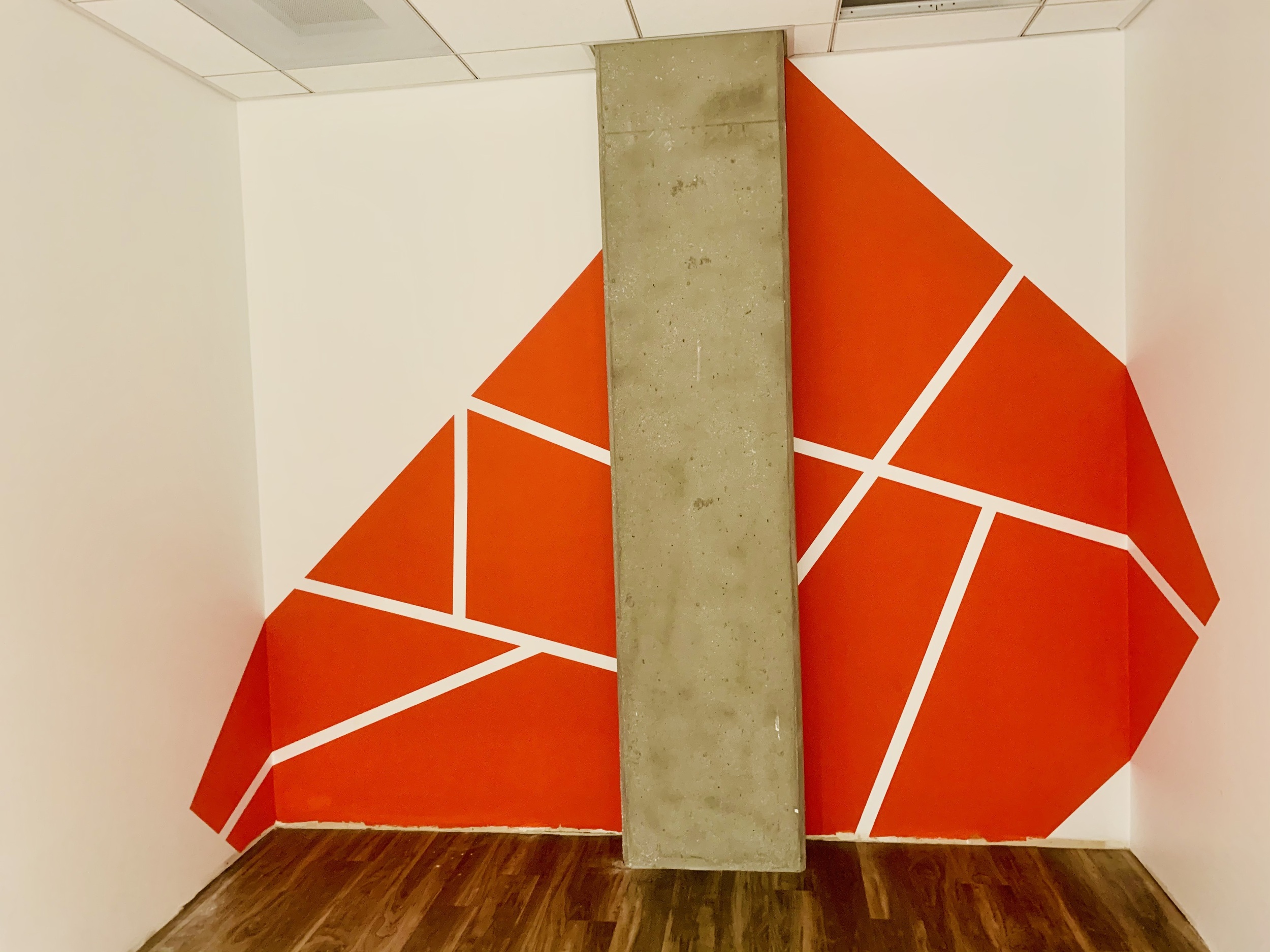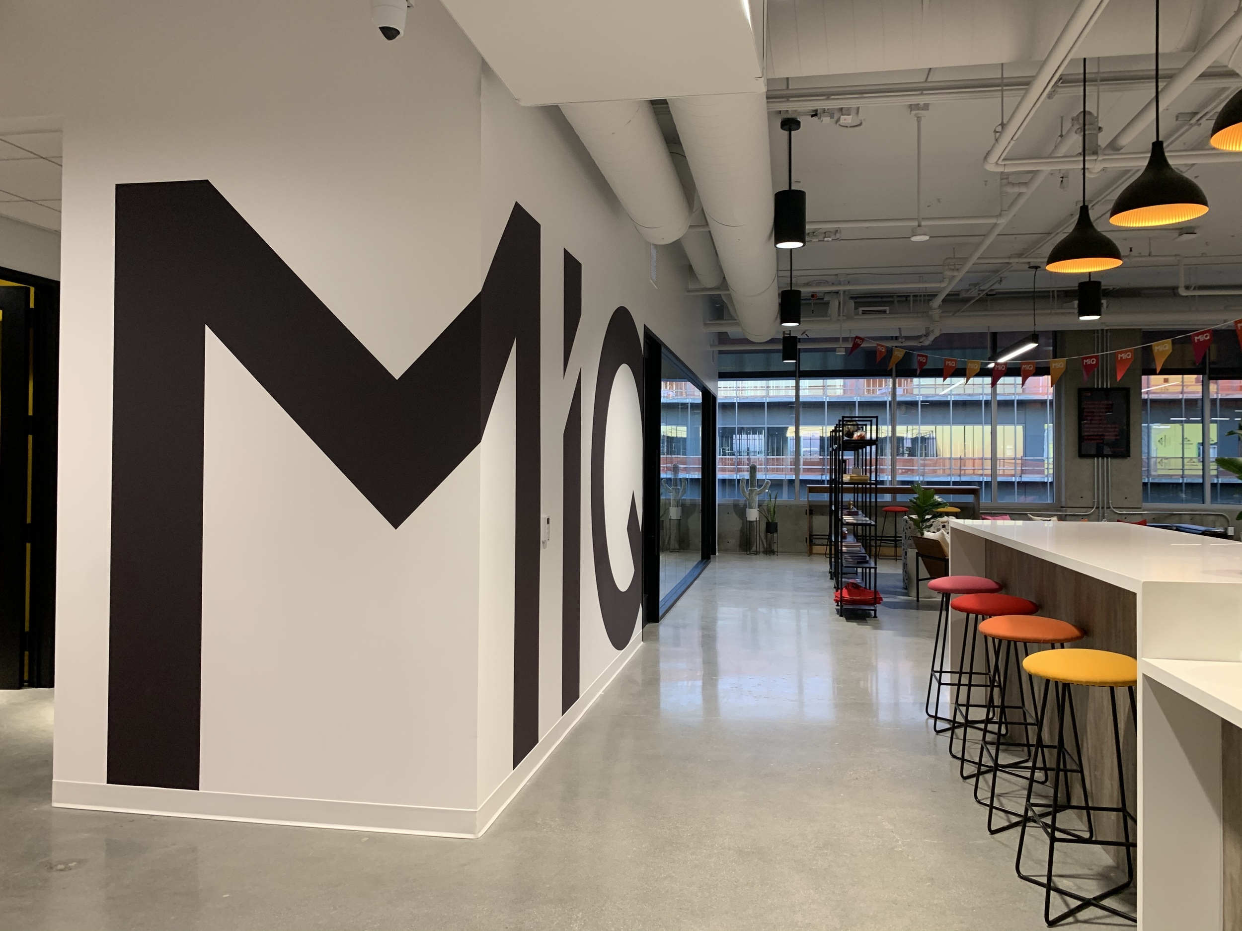 Having already added a few giant logos to other offices Emma new immediately that this corner wall as you entered the office would be perfect for one of her giant MiQ's. In addition the this rather than opt for vinyl covering Emma hand painted each of the meeting rooms with a geometric pattern in it's corresponding colour as well as a bespoke 3D geometric wall behind the reception desk using paint and off cuts from the acoustic felt used in the phone booths.