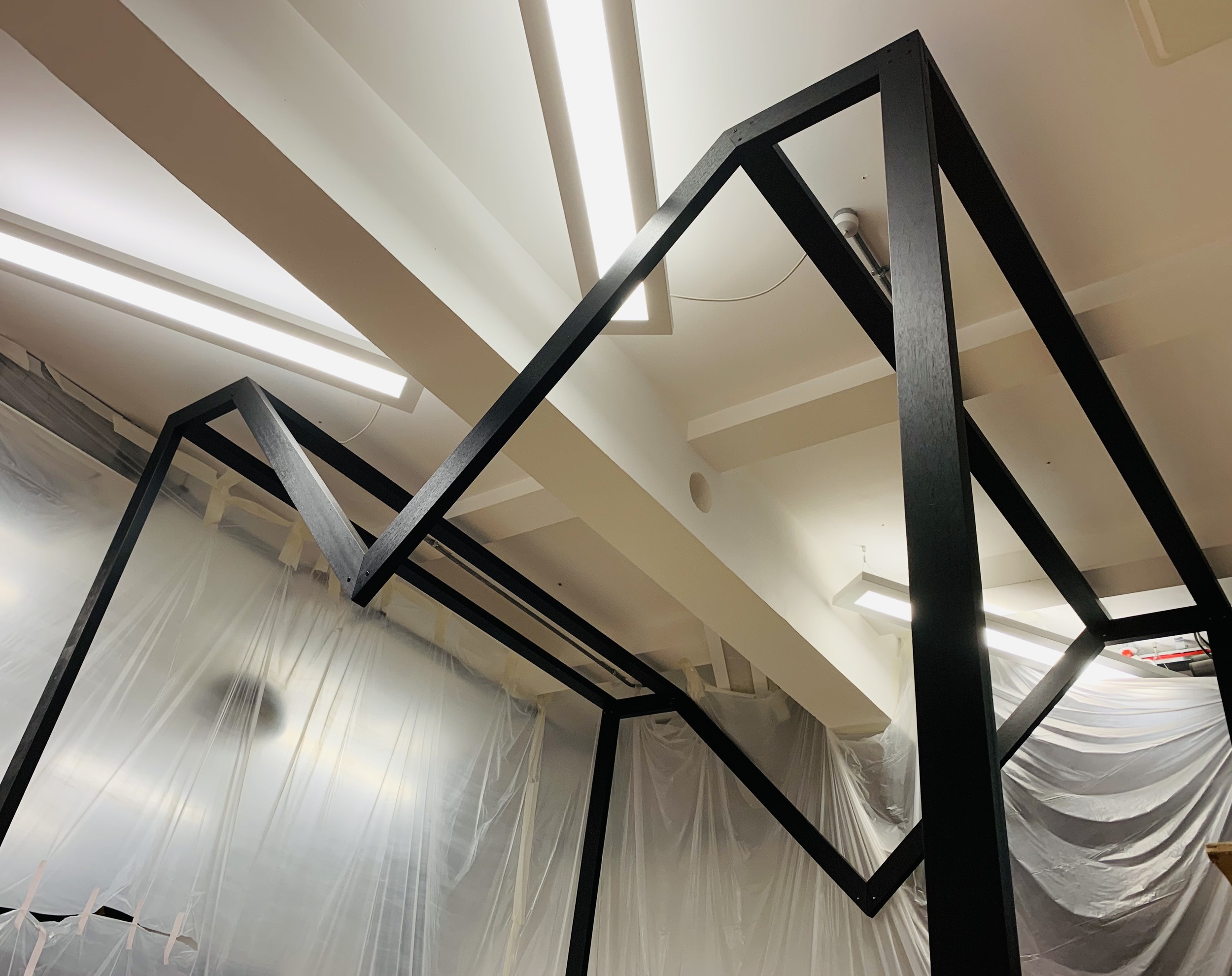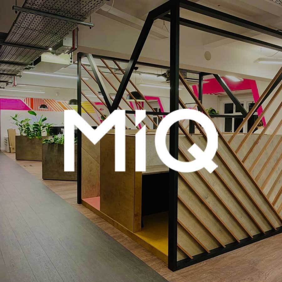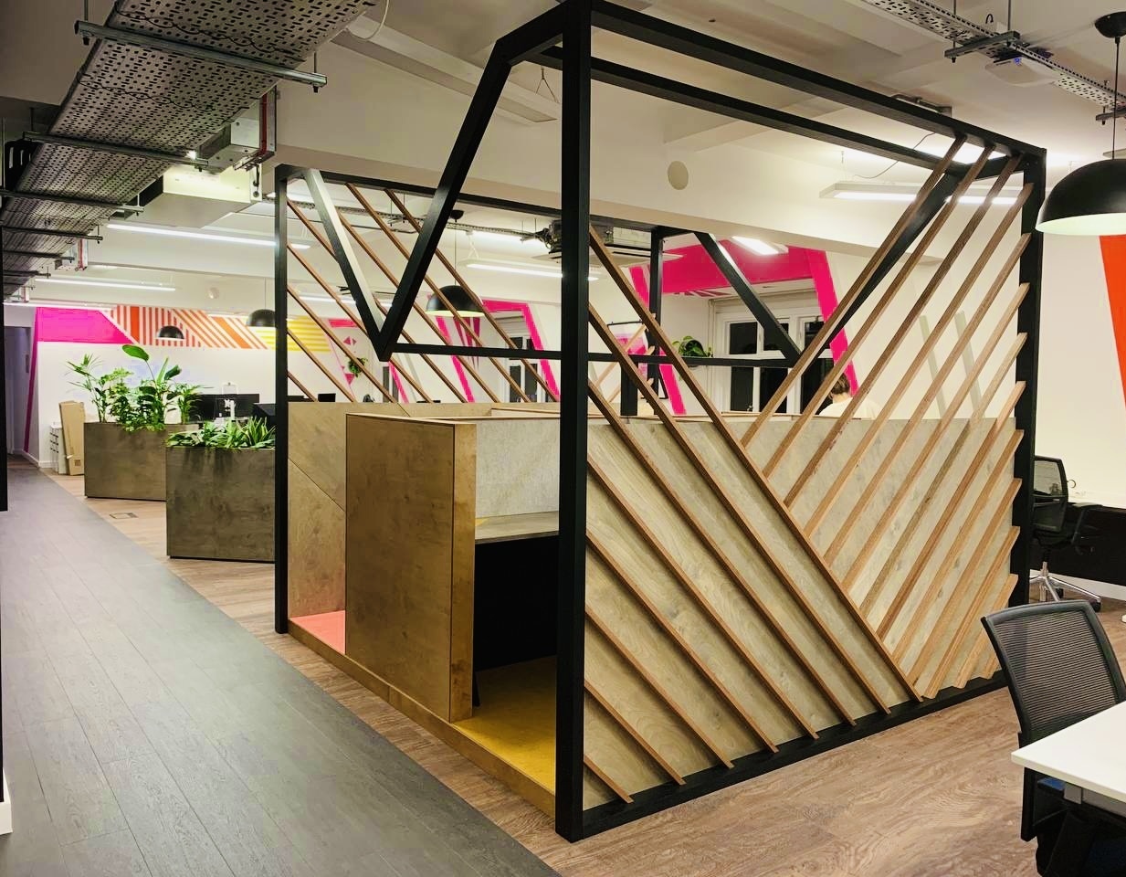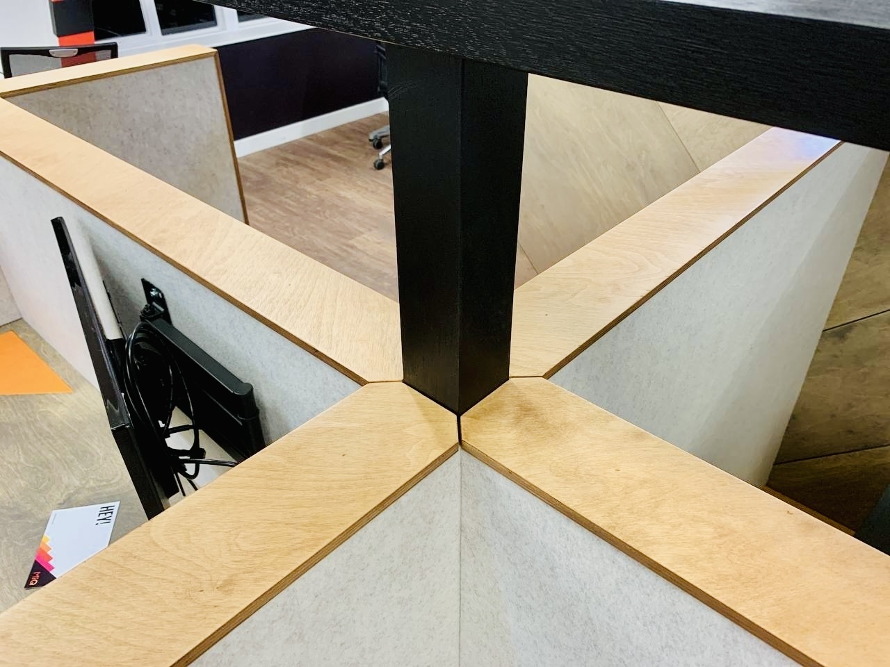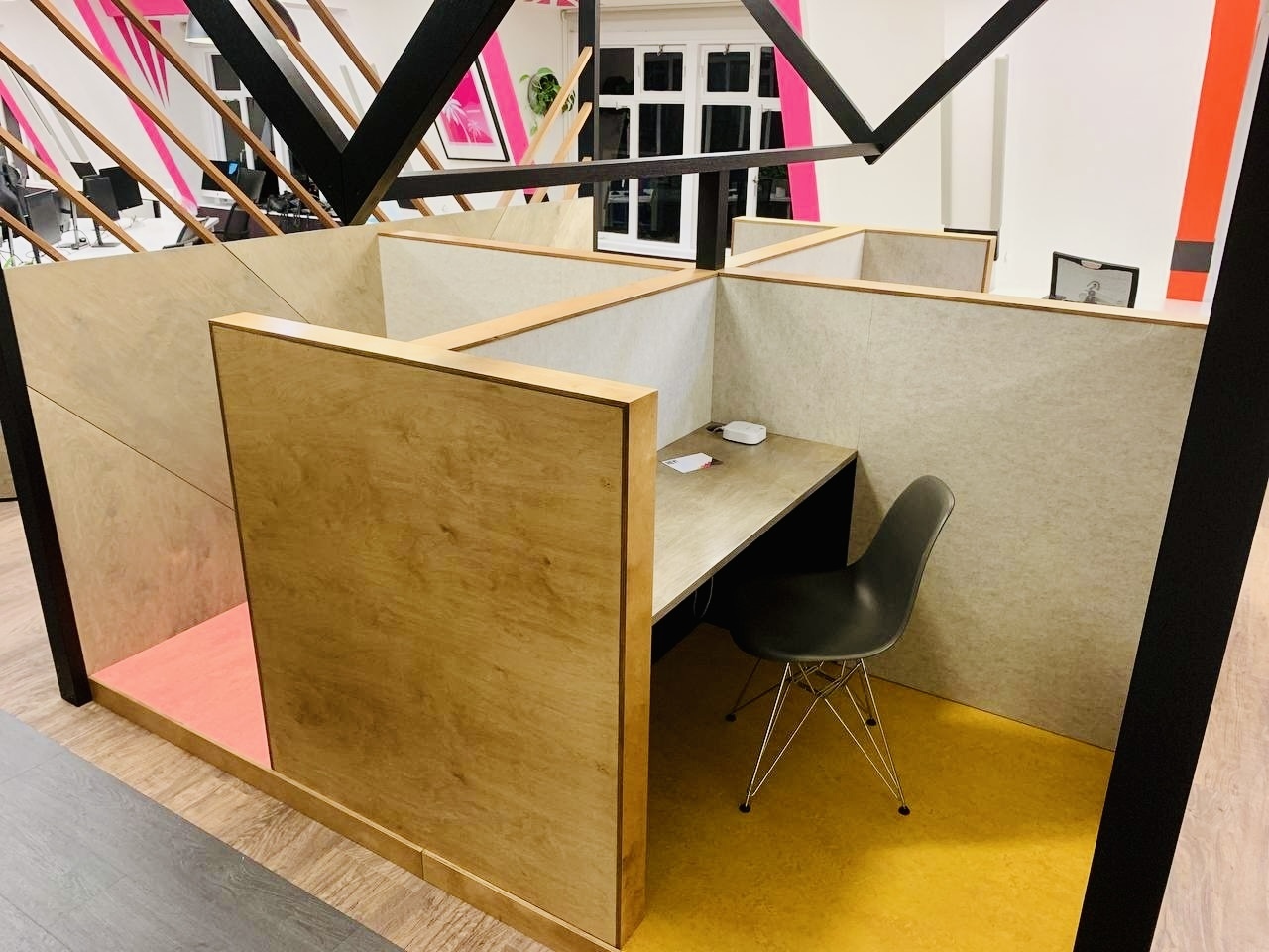 During one of the many renovations of the London office Emma was asked to create a feature space within the 4th floor office that would offer some privacy for people on calls or working on sensitive information without completely cutting them off from the room. Taking inspiration from the logo and using the 4 accent brand colours Emma designed and managed the build of this 2.5 x 2.5 m cube in the shape of an M with 4 individual private workstations, each lined with felt so help buffer external noise.