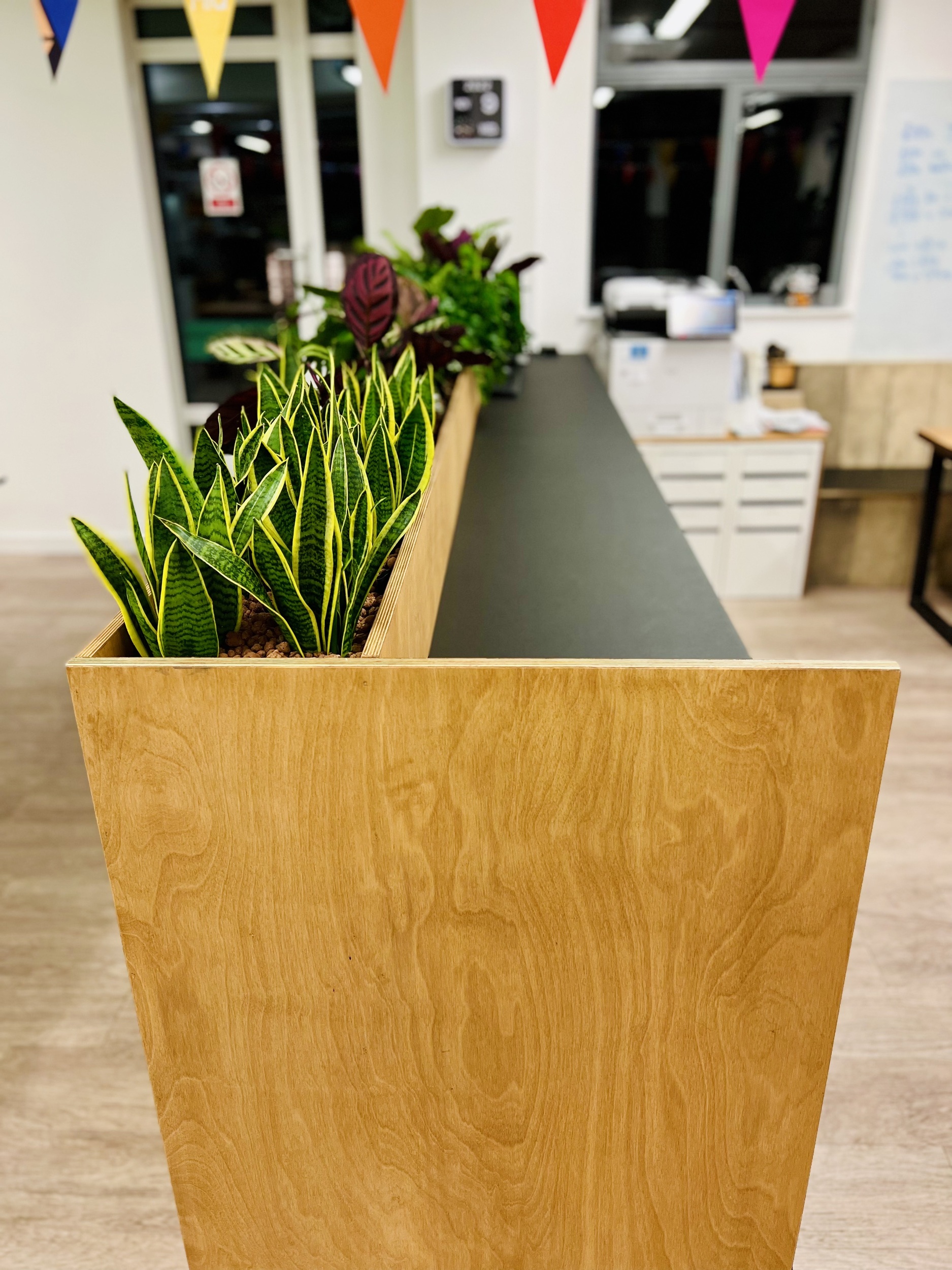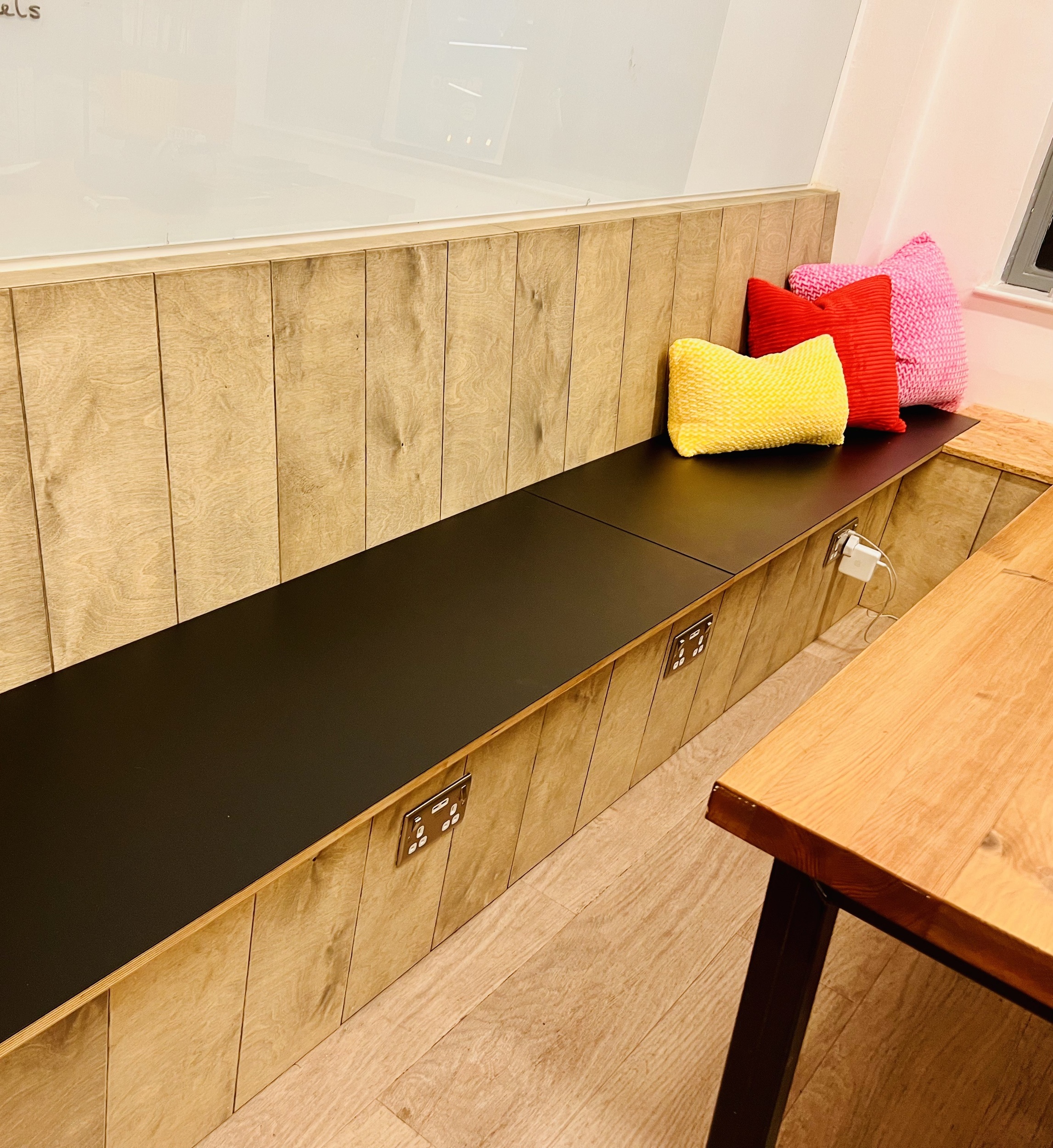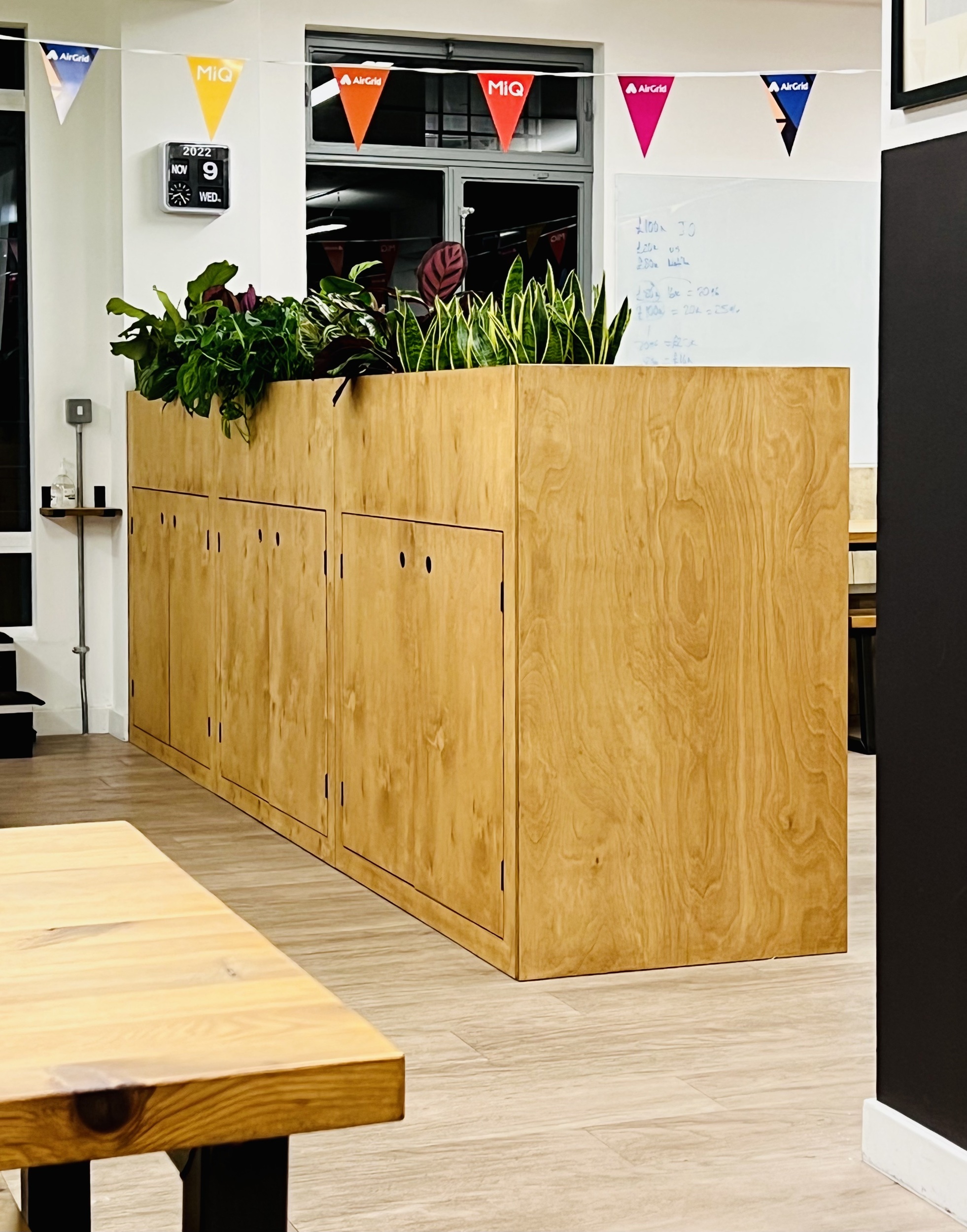 In addition Emma used a tall version o the same style unit just on the other side of this space to create a standing work bench for up to 5 people that also divided seating and games spaces as well as providing storage and a planter to bring in much needed greenery.