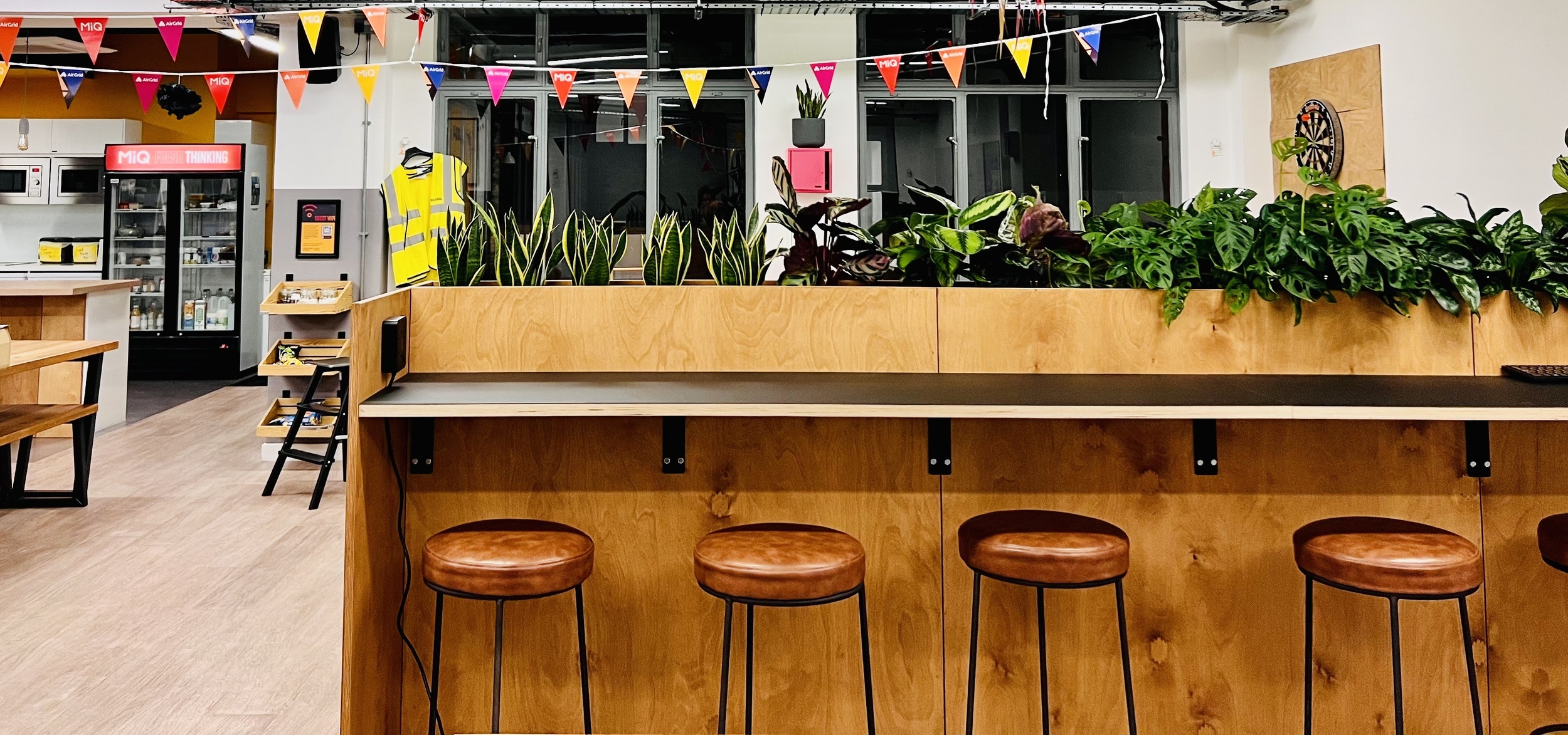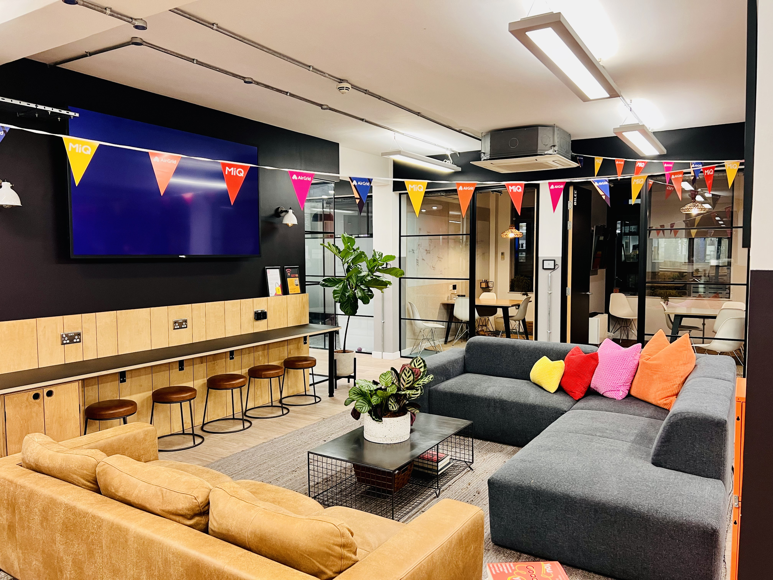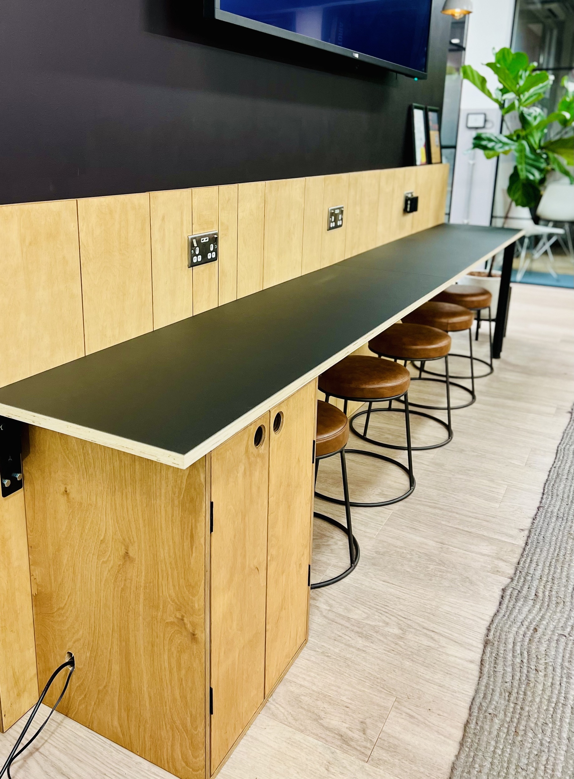With MiQ's impressive global team of thousands the London HQ was frequently pushed to capacity with travelling team members resulting in a lack of desk spaces. To ease this Emma use one of the underutilised walls below the town hall TV to add 5 seats at a low level work bench that also incorporated a cupboard to house the IT equipment for televised team events.