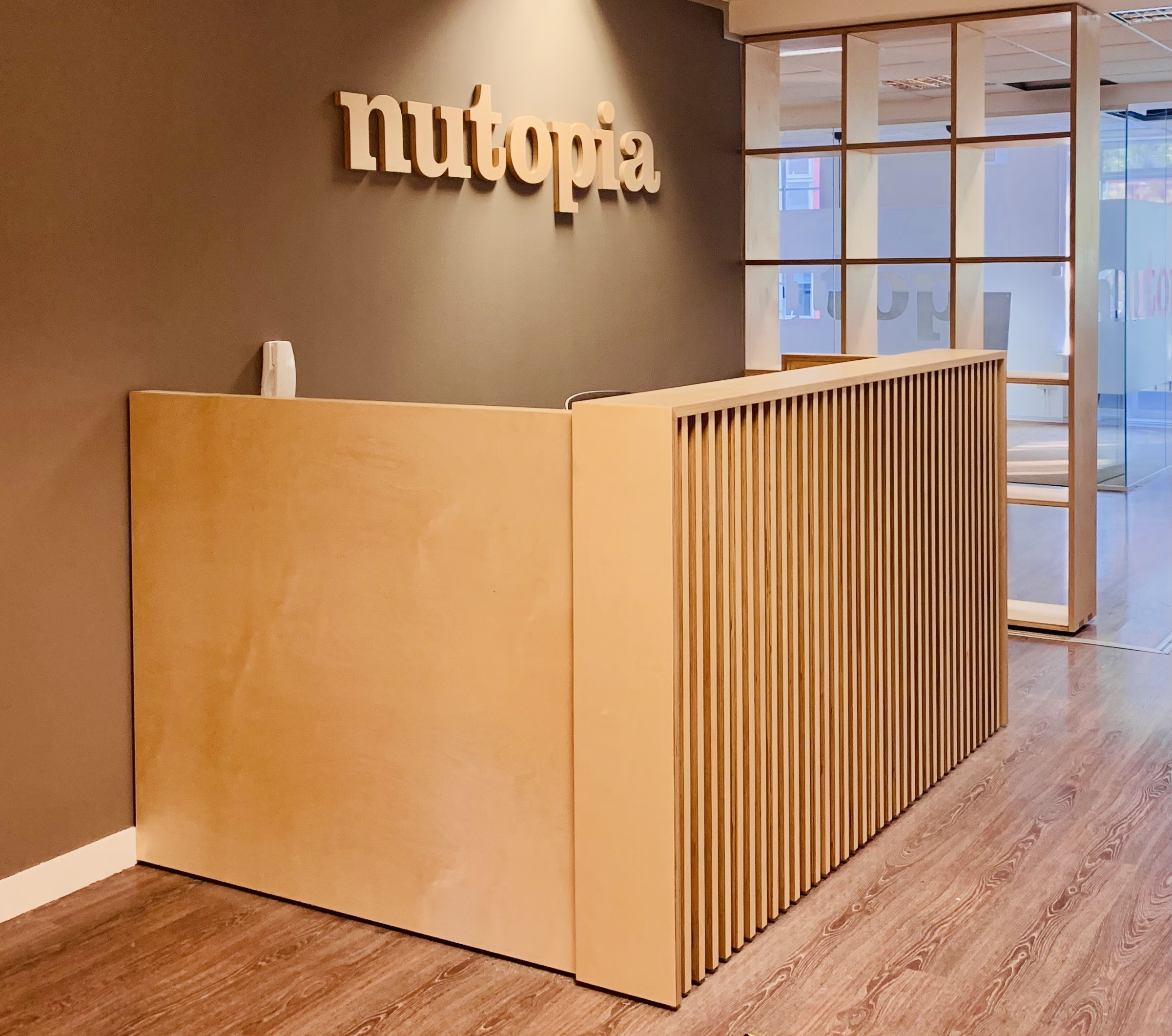 Nutopia approached Emma via and old client asking for help updating their reception area asking for a new desk and library. As a successful TV production company they wanted their welcome area to be fresh and modern so using natural birch ply she designed and project managed the construction of these two striking pieces of furniture.