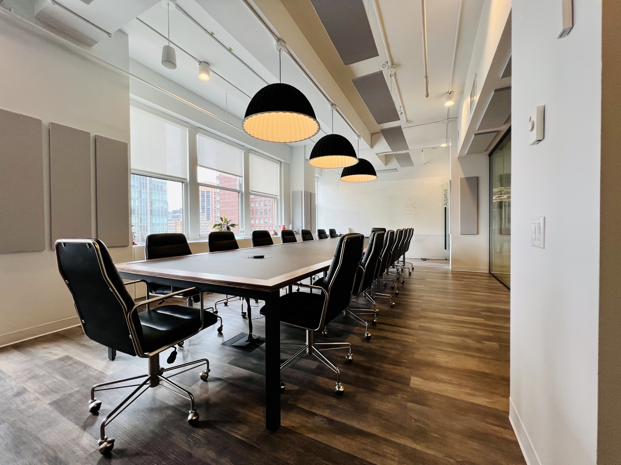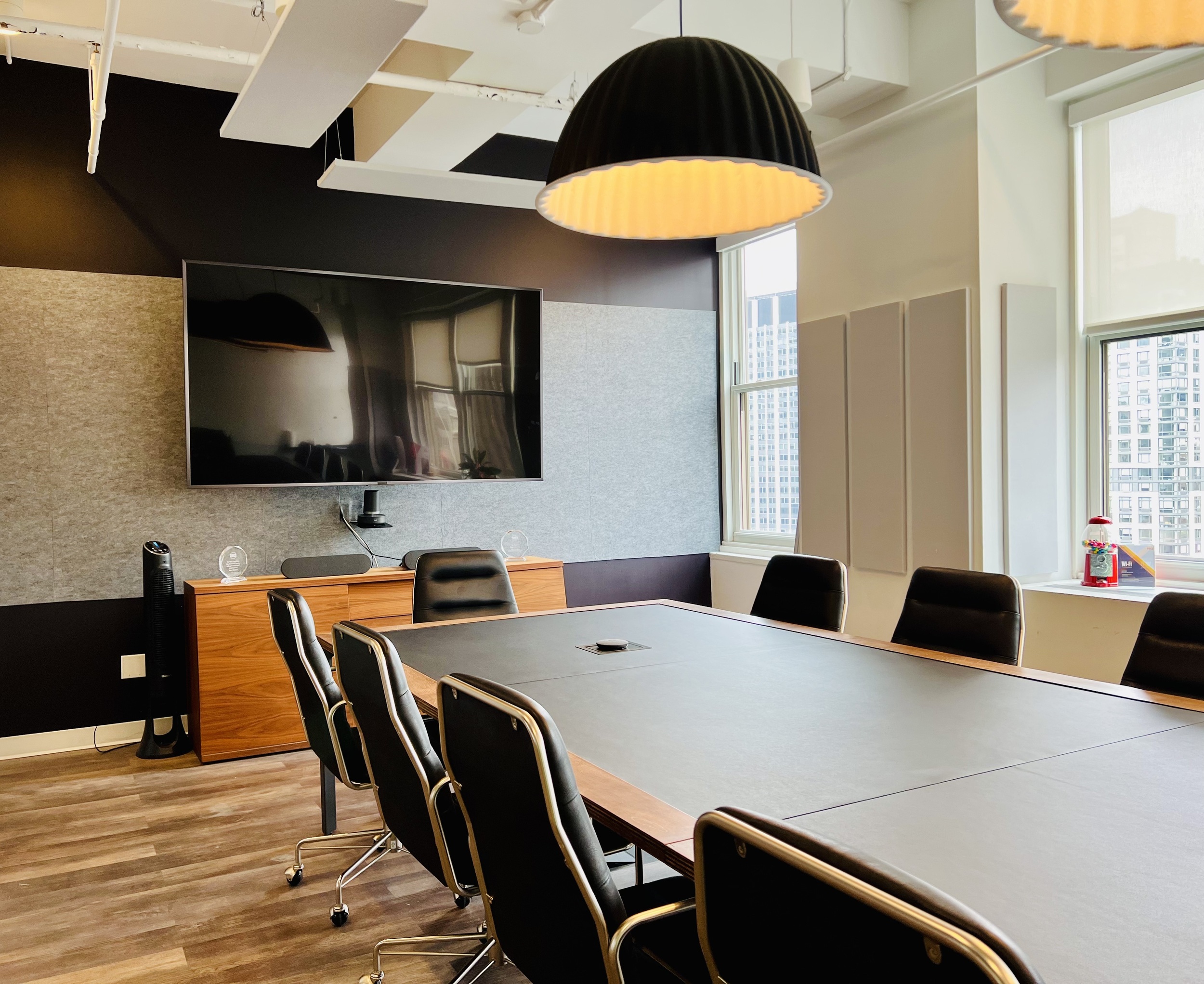 The original Herman Miller table Emma had installed in the NY office hadn't quite stood the test of time in this very bright and hevily air conditioned room and the formica had started to peel away from the MDF structure. Having recently completed the LA office everyone loved what she had done with their conference table ask commissioned her ro recreate something similar for their office. So as not to waste the original tables base Emma designed and built this new surface to fit using a combination of birch ply and Forbo's Furniture Linolium.