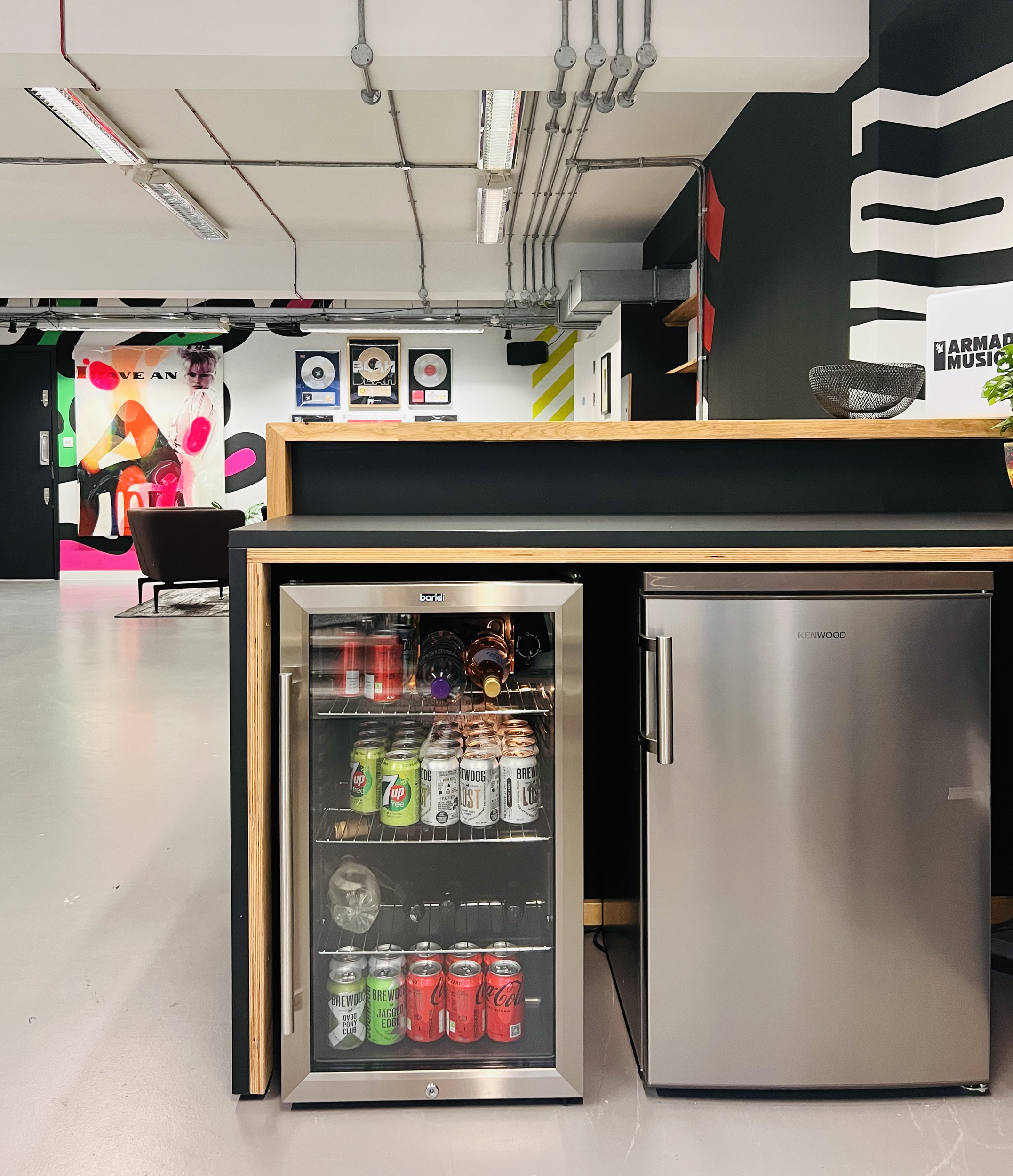 In this open plan space there was no definition between area's so to give the teams and privacy from the tea point. Emma designed and made this bespoke freestanding breakfast bar constructed in ply and oak to both house the drinks fridges and provide some hot desking space that doubles up as an events bar. T make it feel at home in the space she had painted the rear of the unit wo work with the her murals on the walls.