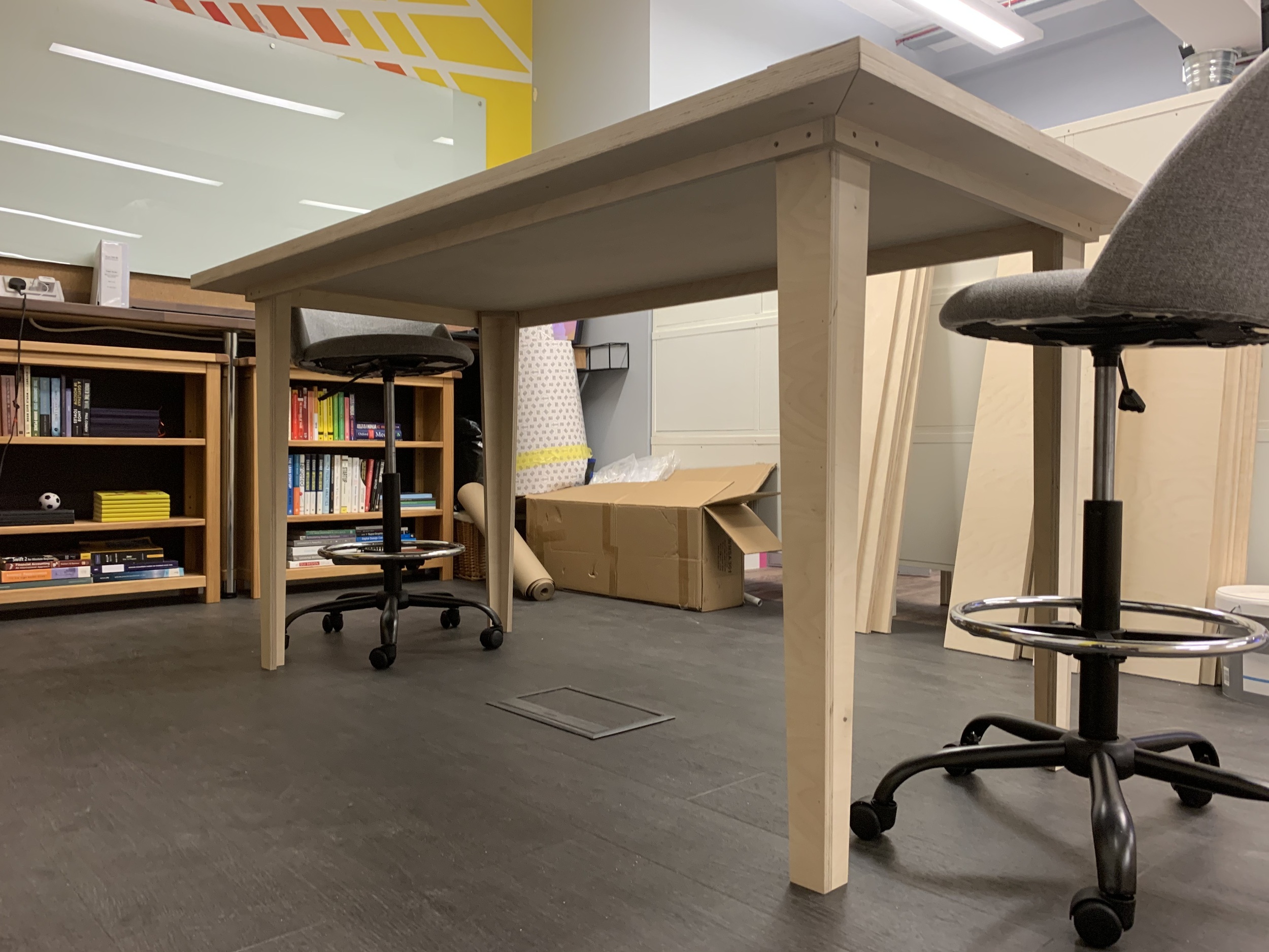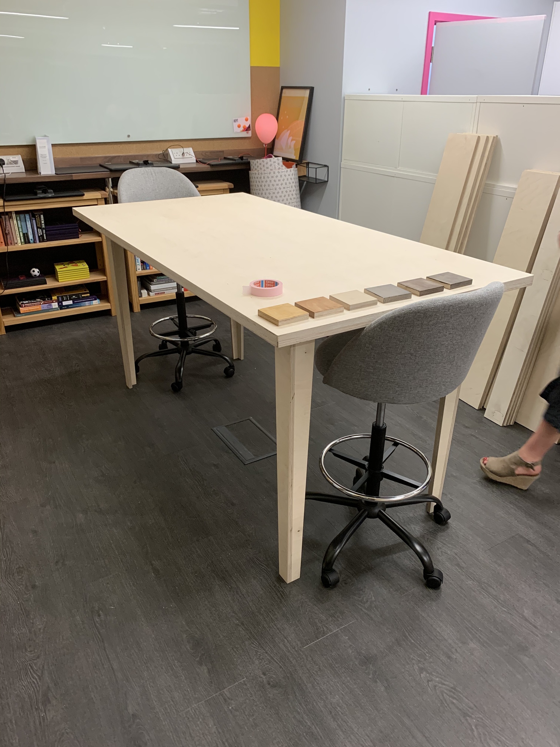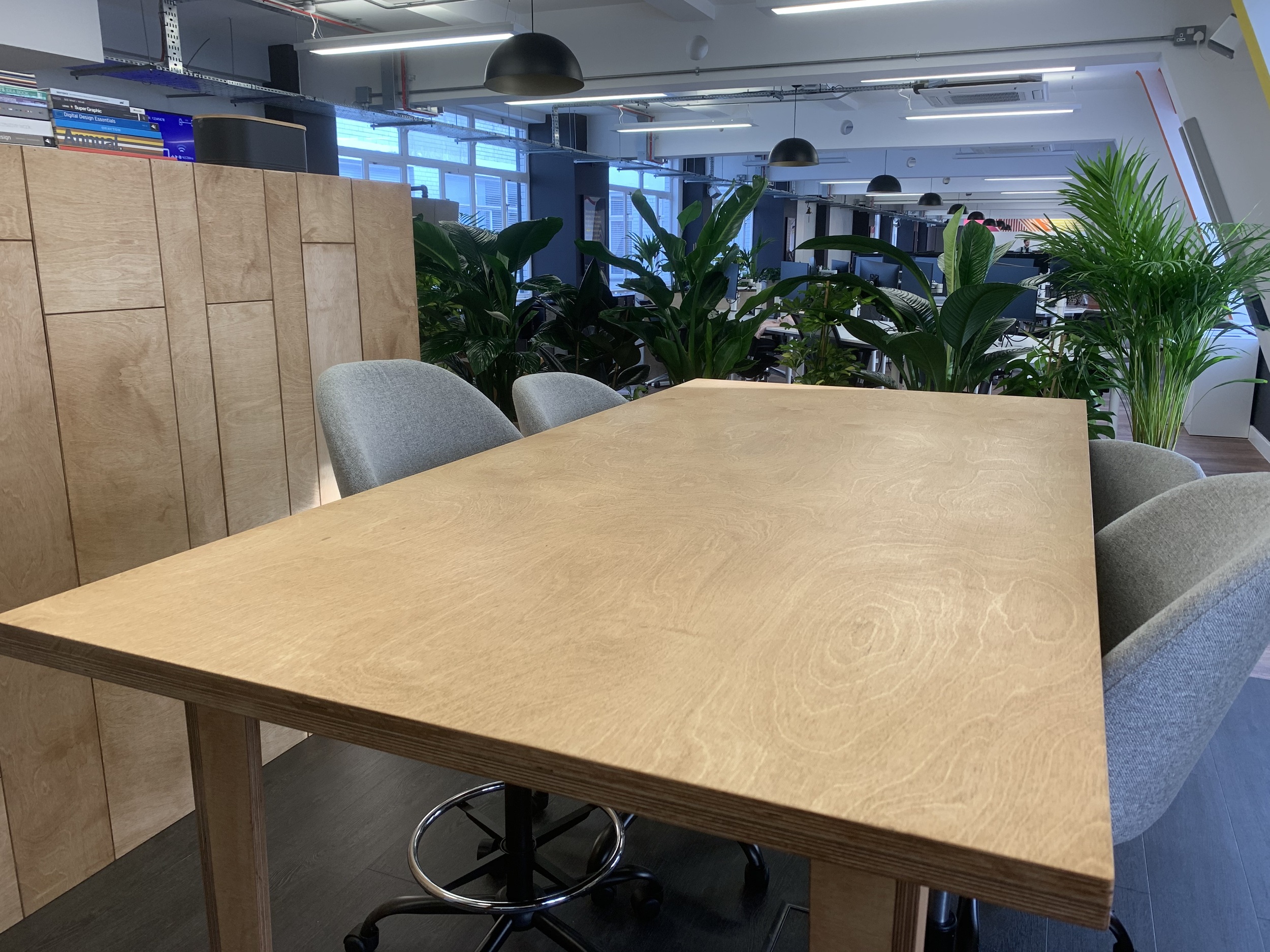 During one of the London office renovations they specifically requested a think tank area where team members could have more active standing meetings with access to cork and white boarding that also doubled as a hot desking space for travelling team members. Re using some of the old lockers Emma designed and had build this simple tall 2.5 m table fully constructed in birch ply specifically for the area.
