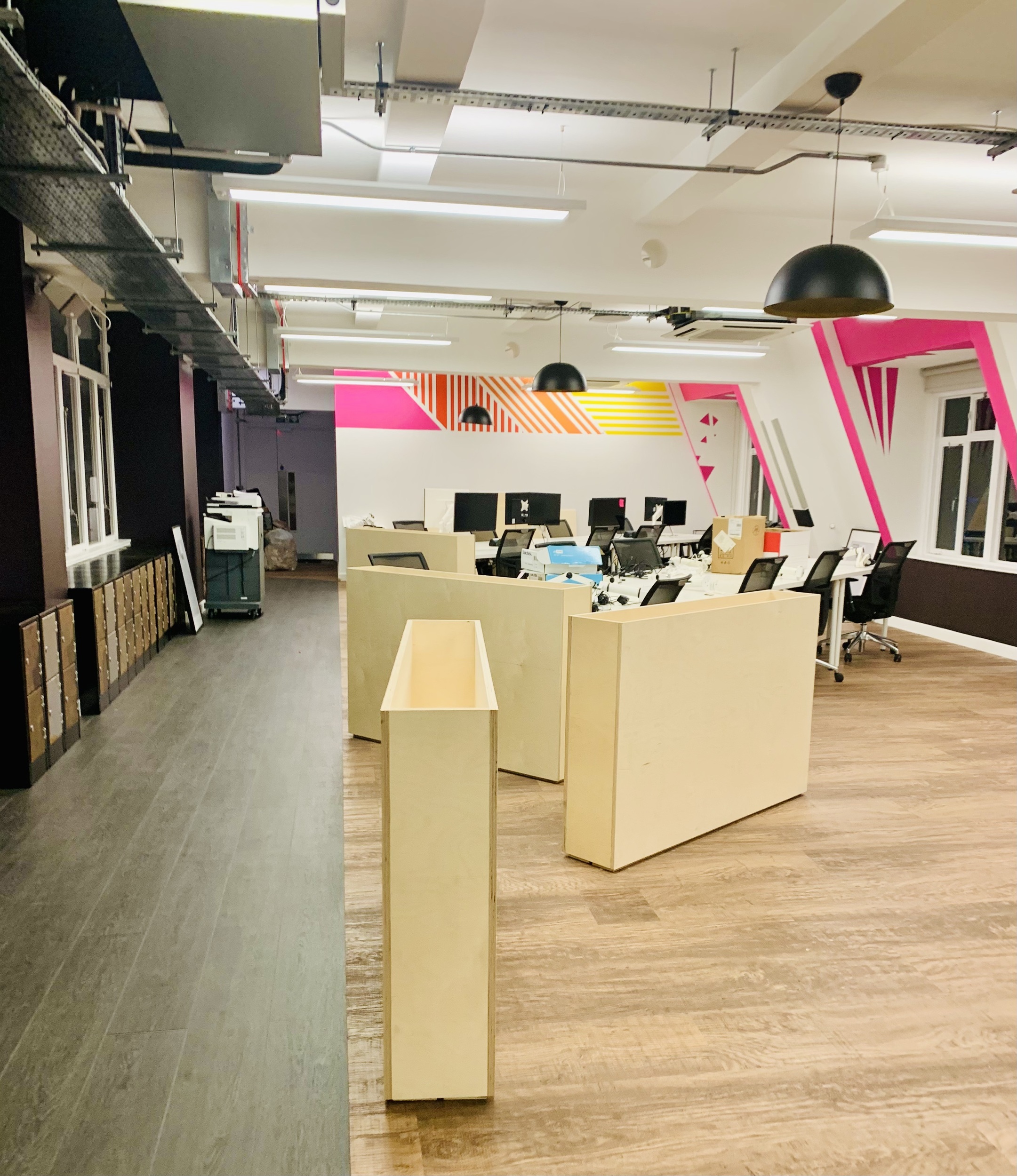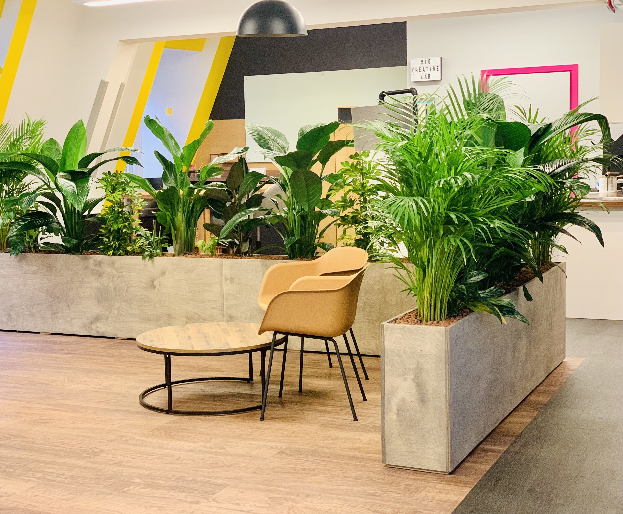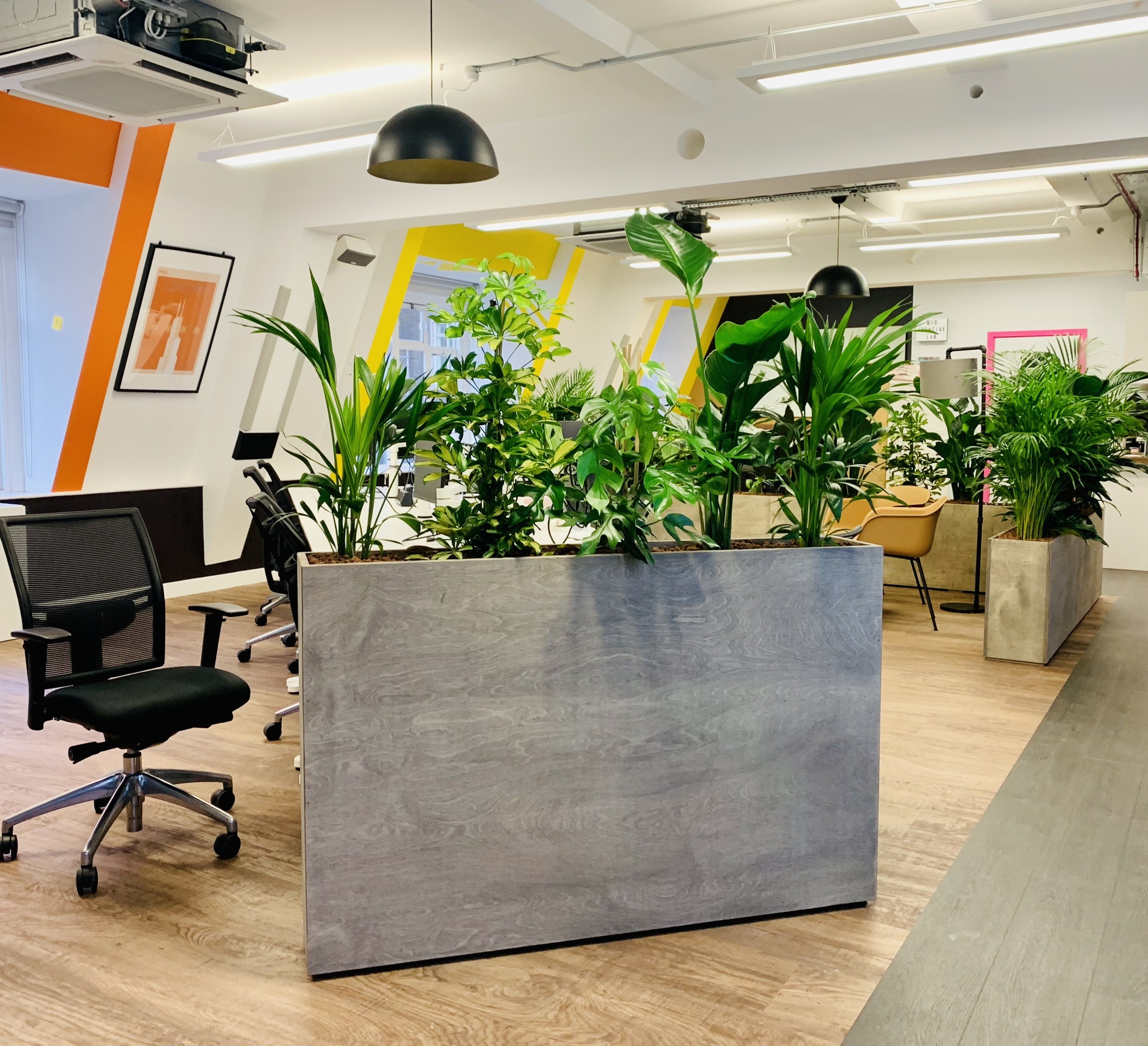 In creating an informal meeting area on the London offices 4th Floor we needed an aesthetically pleasing way to way to divide it from the workstations. The Emma really wanted to bring lots of greenery in to breathe life into the space by improving air quality. Emma designed and commissioned 5 planters, 4 to sit at the ends of desk banks and one large 3 x 2 m corner unit to act as a divider, she collaborated with a planting designer to fill the planters with varieties know for their air purifying excellence and height for added privacy.