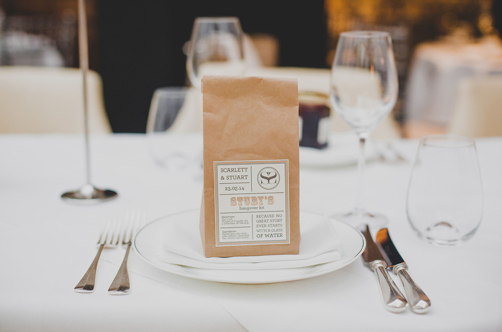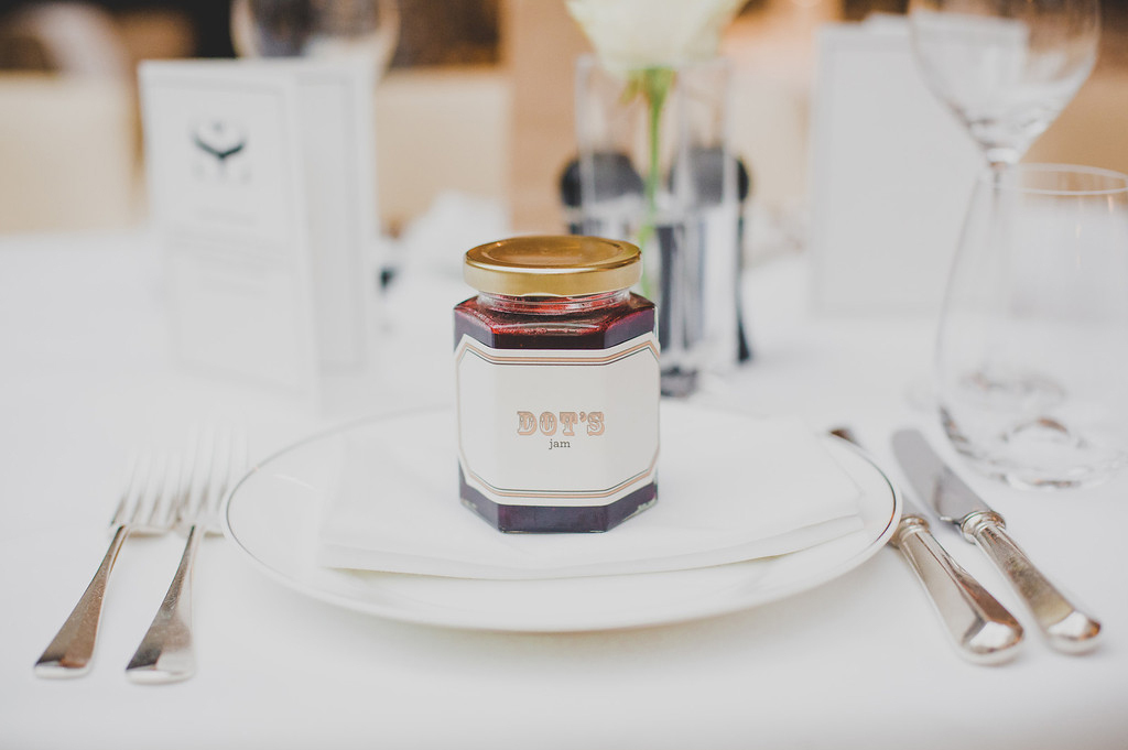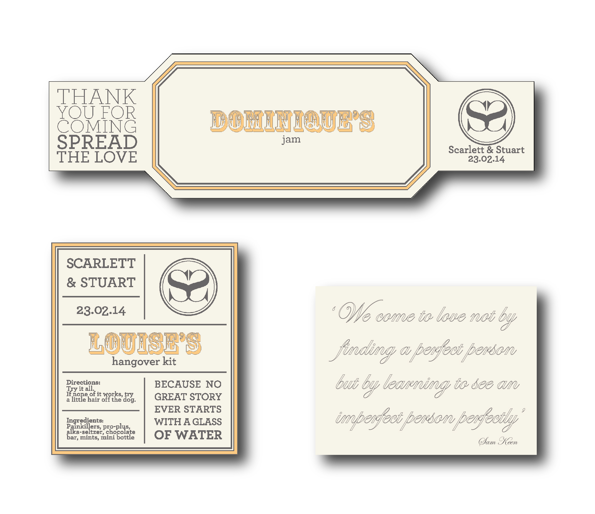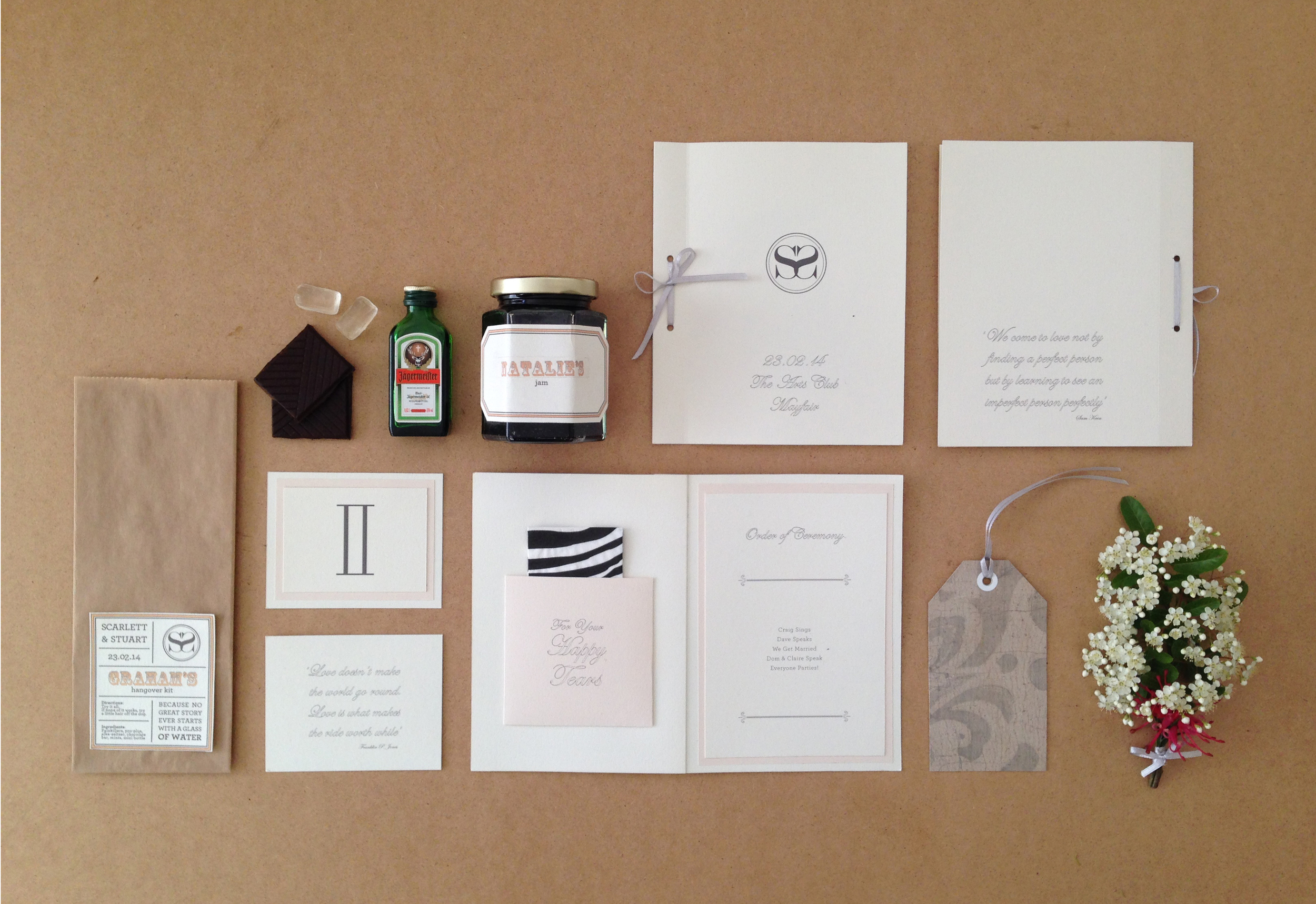 Scarlett and Stuart were holding their wedding at the beautiful Dover Street Arts Club and wanted fully bespoke stationery befitting the elegant venue yet reflective of their playful personalities. Their collection, which was all hand made, consisted of; Orders of service, placement cards, individually named jam jars and hangover kits, wishing tree labels and thank you cards.